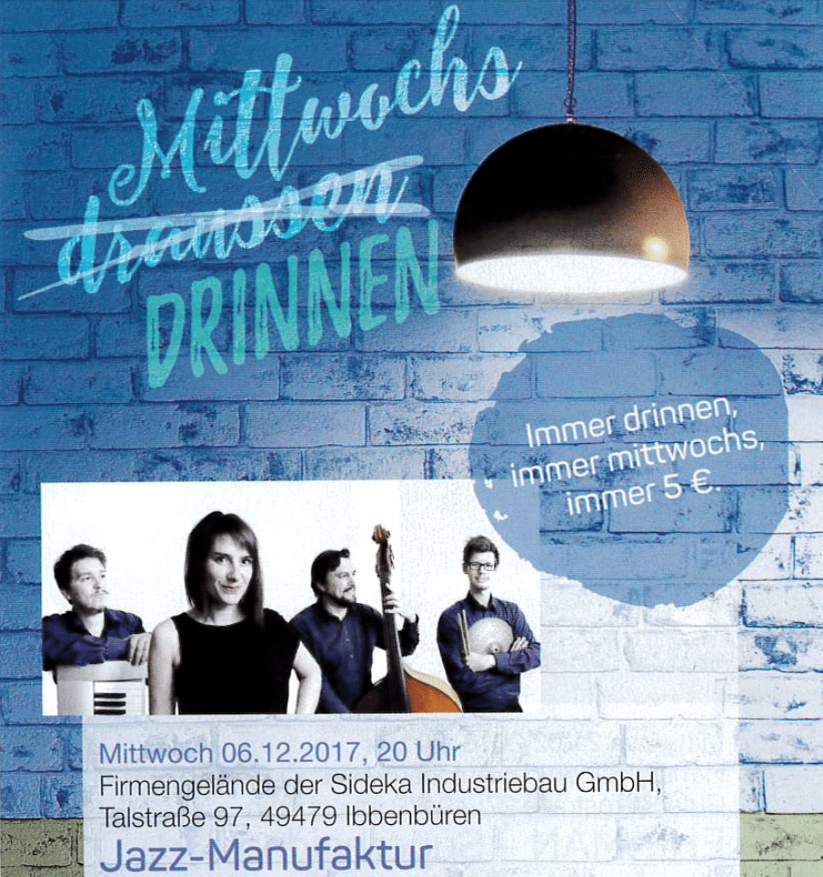 Am Mittwoch den 06. Dezember 2017 spielt die „Jazz-Manufaktur“ ein vorweihnachtliches Konzert im Foyer der Sideka Industriebau GmbH. Die vier studierten Profi-Musiker werden Weihnachtsstücke, Klassiker, moderne Hits & auch Eigenkompositionen spielen. Start ist um 20:00 Uhr. Eintritt: 5€ Kartenvorverkauf: Stadtmarketing Ibbenbüren GmbH Oststraße 28, 49479 Ibbenbüren